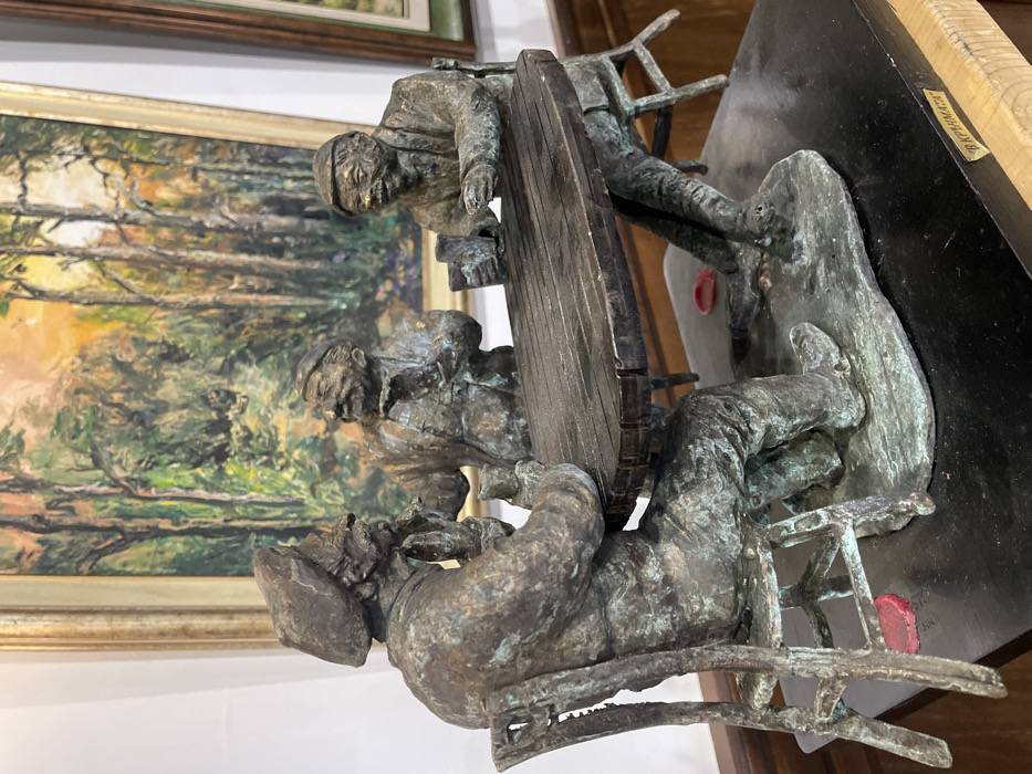 A bronze sculpture depicting three seated male figures engaged in conversation around an oval table is prominently displayed indoors in Golyamo Dryanovo, Bulgaria