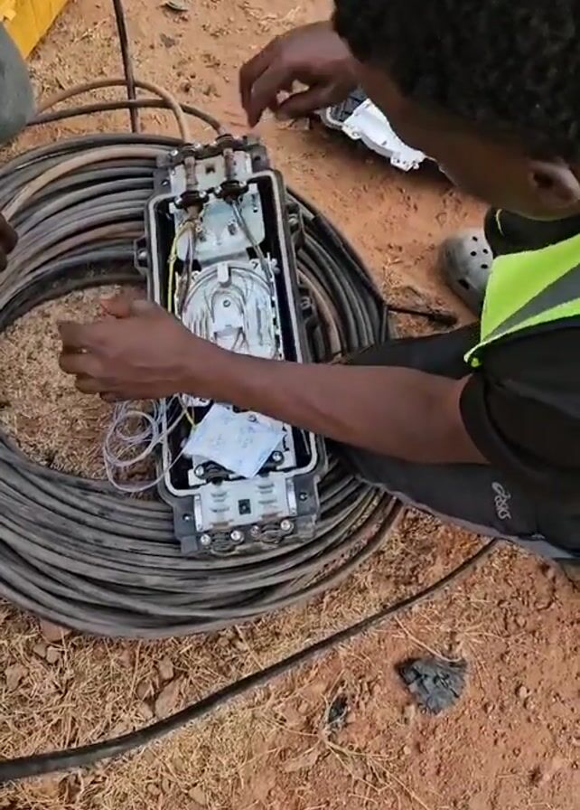 A man wearing a black shirt, black pants, and a bright yellow safety vest is squatting on reddish-brown dirt, working on an open fiber optic splice box. The open box sits on a coil of thick black cable. The cover of the box lies on the ground nearby. Another person in the background holds a thin black cable. The man working on the box uses his hands to manipulate the internal components.