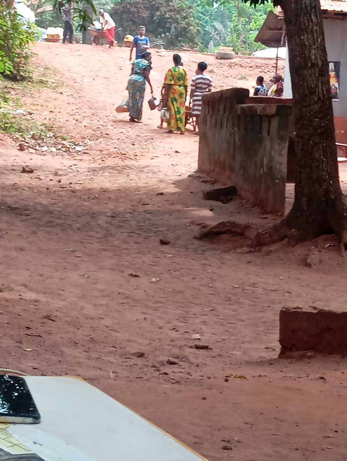 This image depicts an unpaved, reddish-brown dirt path in Okpatu-Ukehe, Nigeria, under daylight conditions. The path ascends gently towards the background, flanked by sparse vegetation on the left and a low-height, weathered wall on the right. In the mid-ground, a person wearing a blue and white patterned garment walks away from the viewer, carrying a light-colored object in their left hand and a brown container in their right. To their right, another individual in a yellow and green patterned garment stands next to a child in a striped shirt, who is near a small, light-colored stool. Further to the right, behind the partial wall, several individuals are partially visible, seated or standing in a shaded area next to a building with a dark roof and light-colored walls, partially obscured by a large tree trunk. In the background, on the ascending path, a person in a blue shirt walks towards the left, while another individual in light-colored clothing pushes a red wheelbarrow loaded with light-colored sacks or goods. Additional figures are visible further up the path on the left. The foreground shows a portion of a white surface, possibly a table or dashboard, with a black smartphone resting on it. Scattered debris is visible on the dirt path.