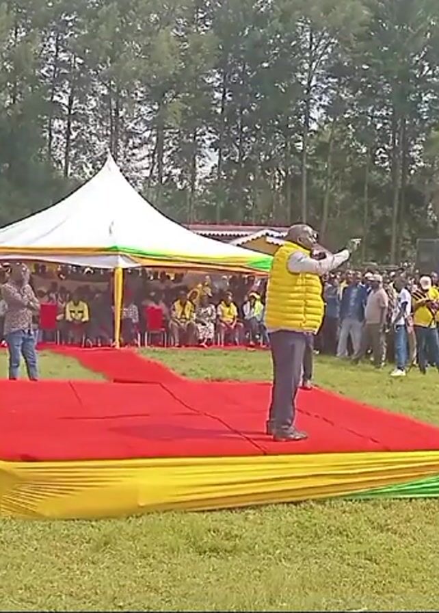 n outdoor political event on a grassy field. There is a small stage covered with a red carpet, yellow and green fabric, and a red carpet walkway leading up to it. A man wearing a yellow vest with “UDA” printed on it stands on the stage speaking to a crowd. There are two large white tents in the background, one with yellow and green trim. People are gathered around the stage, some standing and some seated. A few people are holding phones, likely recording. A speaker stands on a tripod near the stage. Trees are visible in the background. Another man joins the speaker on the stage. The speaker raises his arms, and people in the crowd respond enthusiastically.