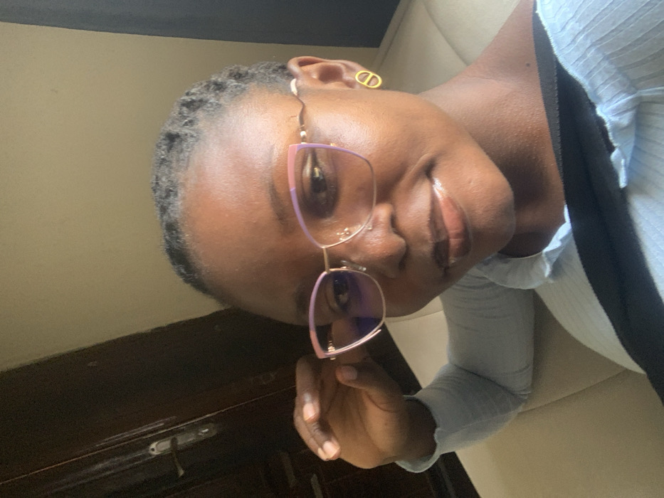 A close-up image depicts an individual, an adult female with dark skin, looking directly at the camera with a slight smile. Her dark hair is styled in close braids or twists. She wears cat-eye glasses with gold-toned lower frames and temples, transitioning to light purple on the upper outer edges; her right hand lightly grips the upper right frame. A gold-colored, stylized 'D' or linked oval stud earring is visible in her left ear. She is dressed in a light blue, ribbed long-sleeved top, with a black strap, possibly a seatbelt or bag strap, diagonally across her chest. The background shows a light-colored upholstered surface, consistent with a seat, behind and to her right. To her left, a dark brown wooden door with a metallic handle is partially visible, above which a plain light beige wall is present. The visual information within the image does not confirm the specified location as Tumfure, Nigeria.