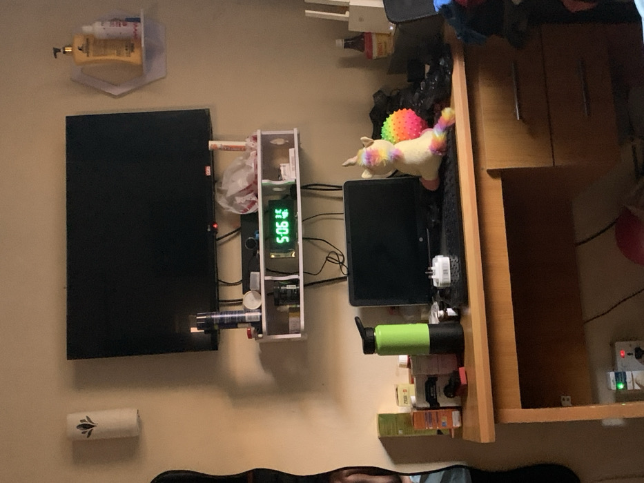 The scene depicts an interior room in the city of Enugu, Nigeria, featuring light-colored walls. A large, black, flat-screen television is mounted centrally on the upper wall. Directly beneath it, a white multi-compartment floating shelf displays a green digital clock reading "5:06," alongside various spray cans, small bottles, and a partially obscured white plastic bag. Multiple black electrical cables hang from behind the television and the shelf. To the right of the television, a white hexagonal wall shelf holds a large yellow pump bottle and a smaller white bottle. A light-colored wooden desk is positioned beneath the shelves. On the desk, from left to right, are several bottles of supplements, a bright green and black reusable water bottle, an open black laptop with a white electrical adapter resting on its keyboard, a multicolored plush unicorn toy sitting facing away from the camera, a rainbow-colored spiked sensory ball, a red-capped bottle, and a pile of clothing on the far right. The desk incorporates two drawers with horizontal silver handles. A white, wall-mounted automatic air freshener dispenser with a dark floral motif is visible on the upper left wall. A power strip with indicator lights is partially visible under the desk. No individuals are present in the image.