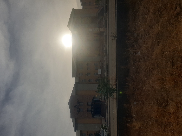 A hazy view of a building against a bright sun, partially obscured by clouds. The building's architecture features multiple stories and visible windows. A sidewalk runs alongside the building, with sparse vegetation beyond it. The overall scene is washed out due to the strong sunlight.