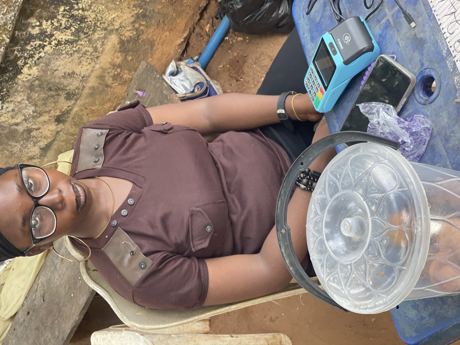 A dark-complexioned female is seated in a light-colored plastic chair, looking directly at the camera. She wears a dark brown short-sleeved V-neck shirt with dark faux leather shoulder patches detailed with silver buttons, dark trousers, a black headwrap, black-rimmed glasses, large gold hoop earrings, and a thin gold necklace. Her lips are dark. On her left wrist, she wears multiple dark beaded bracelets, and on her right wrist, a black wristband and a yellow cord. A light blue plastic table is positioned in front of her. On the table, from left to right, are a clear plastic cylindrical container with a decorative clear lid and a black handle, a crumpled purple plastic bag, a dark-colored smartphone placed face-down, a light blue and black PAX A910 Point of Sale (POS) terminal, and a black USB cable. The background on the left features a light-colored wall, while the right side shows an earthy-toned rough surface with a blue pipe and a black plastic bag. Loose wooden debris is visible behind the chair. The scene is located in Umunekwu, Nigeria.