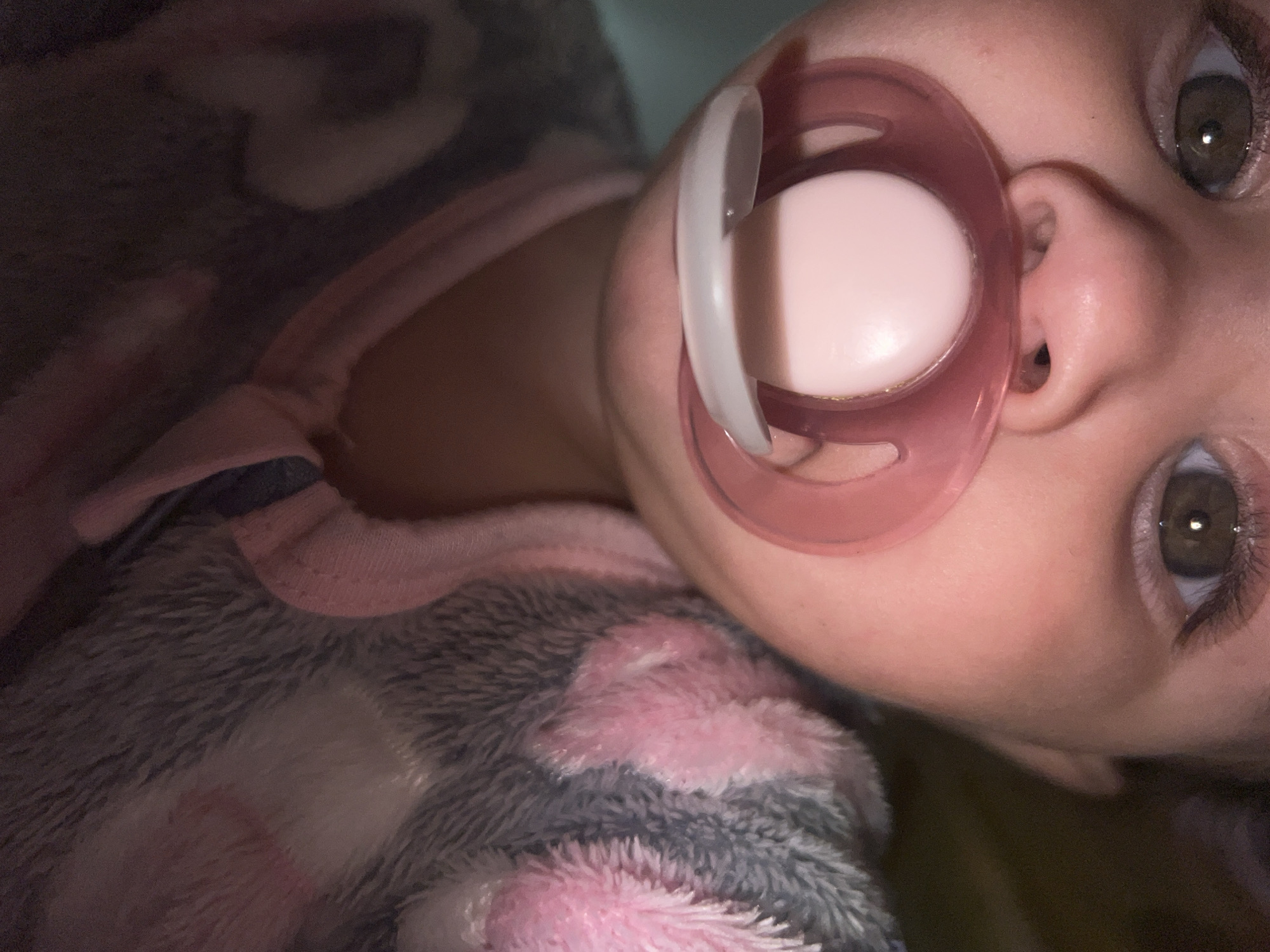 A close-up, tilted shot focuses on a baby with a pacifier. The baby has light skin, brown eyes, and dark eyelashes. The pacifier has a pink circular shield and a white nipple. The baby wears a pink and gray patterned fuzzy outfit. The background is dark and indistinct. The location is not discernible from the image.