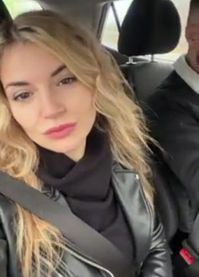 A blonde woman in a black leather jacket and scarf films a selfie video from the passenger seat of a car. The camera occasionally shows a bearded man in a dark jacket driving. The background is blurry as they drive. Music plays in the background.