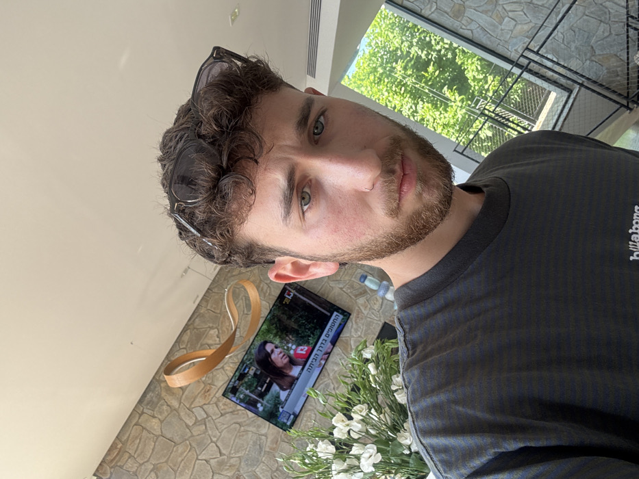 The image depicts an indoor scene in Mevoot HaHermon Regional Council, Israel. The primary subject is a young adult male positioned in the foreground, facing the camera for a selfie. He has light skin, short curly brown hair with dark sunglasses resting on top, a trimmed brown beard and mustache, and light-colored eyes. A small silver nose ring is visible in his left nostril. He is wearing a dark gray striped t-shirt with a "Billabong" logo. The background features a textured stone wall. Mounted on this wall is a flat-screen television displaying a news broadcast, showing a female figure and Hebrew text including "News 13." Above the television, an abstract, curved wooden or metallic art piece is affixed to the wall. To the left of the subject, a large arrangement of white flowers with green foliage partially obscures the television. To the right and behind the subject, a large window or glass panel reveals a view of lush green trees and bright sunlight outdoors. Below the window, a modern staircase with dark metal railings descends, integrated with the stone wall. The scene is brightly lit.