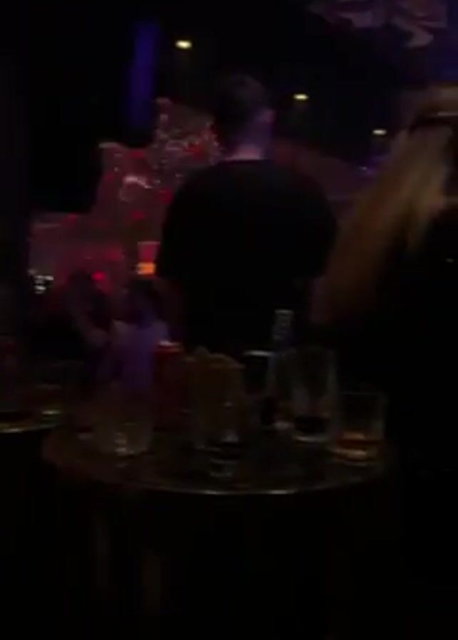 dimly lit nightclub scene. The camera focuses on a small round table with several empty glasses and bottles on it. People are moving around in the background, some standing and talking, others walking through the crowded space. The lighting is a mix of purple, pink and blue, creating a club-like atmosphere. Some large circular objects are hanging from the ceiling.