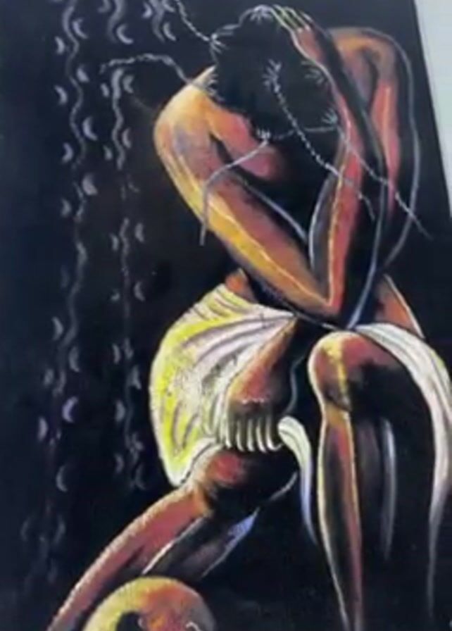 painting of a person sitting in a distressed pose with their head in their hands. The background is mostly black with some curved lines descending from the top. The figure is colored in shades of yellow, red, and brown, wearing a white garment around the waist. At the bottom of the painting, there's a sphere that seems to be cracked. The camera slowly moves, showing the artwork from different angles.