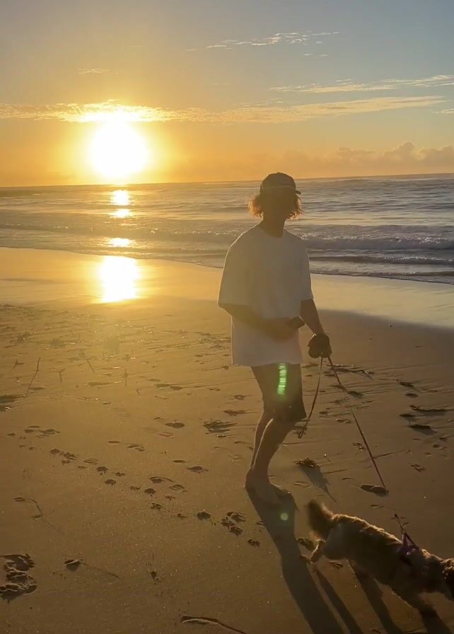 A person walks a small dog on a leash along a sandy beach. The sun is rising over the ocean in the background, casting a bright glow on the sand and water. The person is wearing a white t-shirt, dark shorts, and a baseball cap. The dog is brown and fluffy. There are footprints in the sand. The sky is clear with a few wispy clouds.