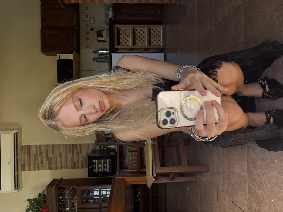 The scene depicts a young adult female crouching on a light brown tiled floor within a residential kitchen and dining area in Quilmes Oeste, Argentina. She has shoulder-length blonde hair, light skin, and a septum piercing, and wears a black sleeveless top with lace trim, a long black ruffled skirt, and dark, pointed-toe flat shoes with two vamp straps. Both wrists display multiple silver-colored bracelets. She holds a smartphone, identified as an iPhone with a clear and red-edged case featuring a prominent gold MagSafe ring, in both hands, angled for a frontal view, with her gaze directed towards the screen. The background consists of light beige walls. A white air conditioning unit is mounted high on the back wall, above a vertical panel of decorative horizontal brown and beige tiles. To the left, a dark wooden hutch containing wine glasses, a wooden dining chair with a light cushion, and a dark wooden wine refrigerator with bottles inside are visible. To the right, kitchen elements include dark wooden upper cabinets, a white microwave on a shelf, and a white refrigerator with a three-tiered wooden open shelving unit adjacent to it. A metal thermos, another metal container, and a silver pot are present on the countertop, above a light-colored tiled backsplash. Further right, a dark brick wall section is visible. The scene is brightly illuminated, suggesting natural light.
