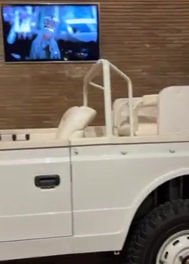 The camera pans around a white open-top vehicle with black tires. The car appears to be in a showroom or garage with a brick wall. A television on the wall shows a program with several figures wearing white clothes.