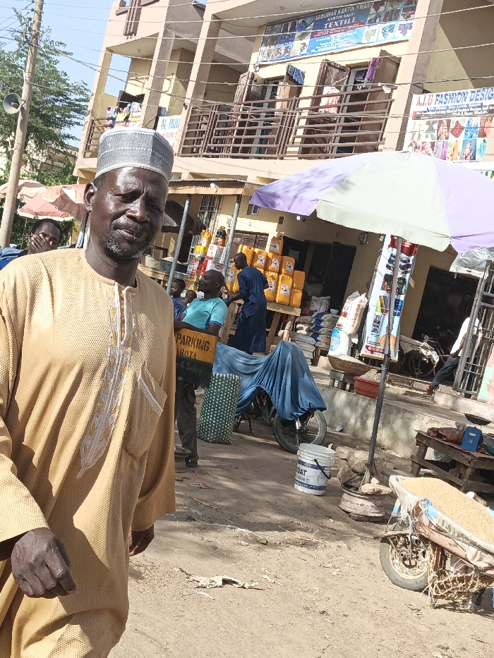 An adult male, approximately middle-aged, with dark skin, a short dark beard, and a gray-patterned cap (kufi) is prominently positioned in the left foreground, looking slightly right of the camera. He wears a light brown, embroidered kaftan. The scene depicts an outdoor commercial street in Kawaji, Nigeria, under clear skies. Behind the foreground subject, other individuals are visible: a partially obscured male behind his left shoulder, a male in a light blue t-shirt holding a yellow sign partially reading "PARKING AHOTA & Safety," and another male in a dark blue garment attending to a display of stacked yellow plastic containers (possibly containing oil or chemicals). The unpaved ground features dirt, loose debris, and shadows. A motorcycle covered by a blue tarp is parked near a white "BOAT" branded bucket. To the right, a light purple and white striped umbrella shades a market stall displaying various packaged goods and sacks of granular material. A wooden table with a scale and what appears to be a two-wheeled cart laden with grains is visible on the far right. In the background, a two-story building with a light brown facade houses multiple shops. Prominent signage on the building includes "DABUWAR KANTIN KWARI KANTIN SAGI TEXTILE" and "A.I.U FASHION DESIGN." Balconies with metal railings are visible on the second floor. A utility pole with wires and a loudspeaker is situated on the far left. The overall scene is a bustling urban market environment.