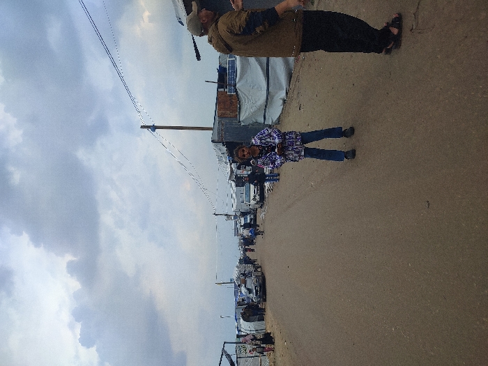 The image depicts an outdoor scene within a densely populated, temporary settlement, identified as being in the city of Al-Mawasi. A wide, unpaved road, appearing to be compacted earth or dirt, extends from the foreground into the background, flanked on both sides by improvised shelters and structures. The sky is overcast with dense grey clouds, indicating diffused natural light. On the immediate right in the foreground, an adult male is partially visible, oriented towards the right edge of the frame. He wears a light brown or olive-colored baseball cap, a brown jacket, dark pants, and dark sandals. His left arm is slightly raised, with his hand open, suggesting a gesture or a moment in conversation. Slightly further into the foreground-center, a younger individual, possibly a child or teenager, stands facing the camera. They wear a multi-patterned jacket (featuring purple, blue, and white tones), blue jeans, and dark shoes. This individual holds a white rectangular object, consistent with a mobile phone, with both hands at chest level. Along both sides of the road, various temporary structures are visible, constructed from materials such as white tarpaulins, corrugated metal sheets, and other salvaged materials, resembling a refugee camp or informal settlement. Several structures on the right side feature small solar panels mounted on their roofs. A wooden utility pole with multiple overhead wires extends from the mid-ground right towards the left across the frame. In the mid-ground and background, numerous individuals are present. On the left side of the road, several people are walking, including women wearing head coverings, near parked vehicles. Multiple cars, including a dark-colored sedan and other indistinguishable models, are parked along the left edge of the road. Further down the road in the center, more people are walking, some appearing to ride bicycles. A white vehicle is partially visible parked on the right side of the road in the mid-ground. The overall scene suggests ongoing daily activity within a temporary housing environment.