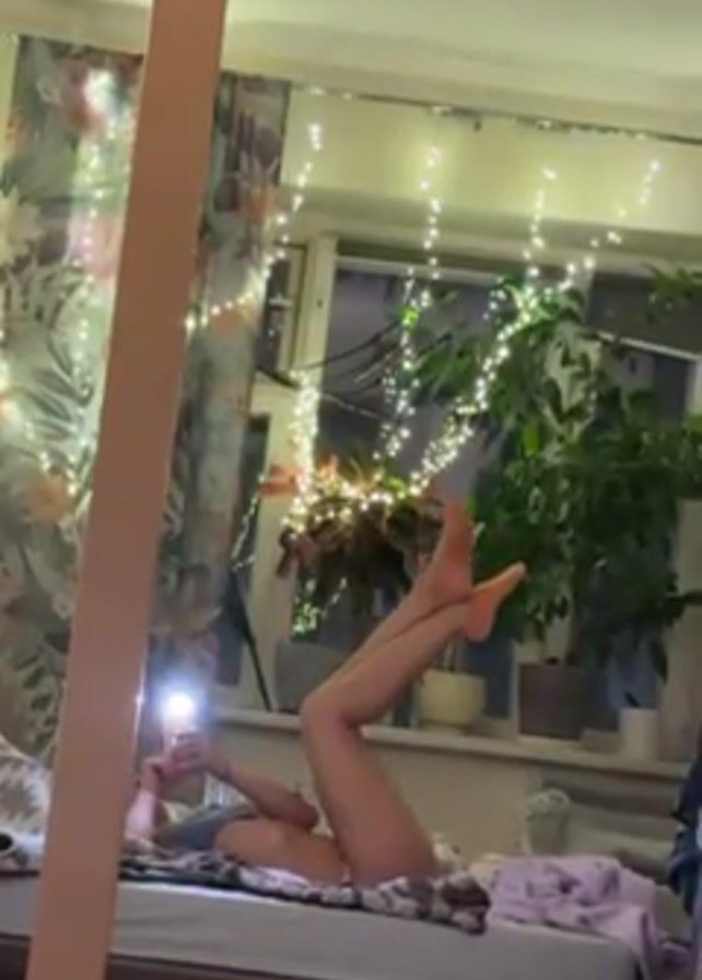 A woman lies on her back in bed, illuminated by the light from a cell phone she's holding. Her legs are raised in the air. The scene is reflected in a tall mirror that takes up the left portion of the frame. In the background, a window is adorned with fairy lights, and several plants are visible on the windowsill. The bed has a wooden frame and is covered with bedding in shades of gray and purple. The room is lit by an overhead light. A curtain with a floral pattern is visible beside the window.