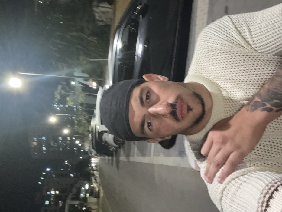 The image depicts a nighttime urban scene in Holon, Israel. A male individual is prominently featured in the foreground, facing the camera directly. He has a dark-colored durag covering his head, a mustache, and a goatee. He is wearing a light-colored, open-knit or mesh sweater. His left hand is resting on his right shoulder/upper arm, revealing tattoos on his left forearm. In the background, a street with a row of parked vehicles is visible. These vehicles include a white scooter or small car, followed by several darker cars. Streetlights illuminate the scene, with one bright streetlight pole prominent on the right side of the frame. Beyond the street and parked cars, multi-story residential buildings with illuminated windows are discernible against the dark night sky. Some sparse vegetation, possibly trees or bushes, is also present in the background. The overall lighting suggests ambient artificial illumination from streetlights and building lights.