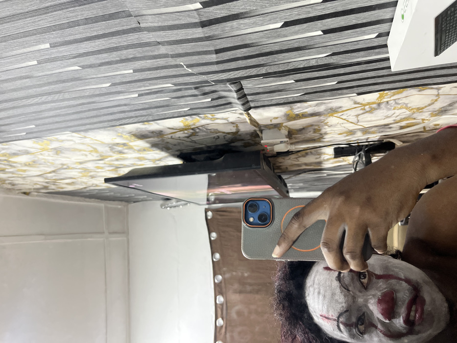 A person in clown makeup holds a phone up, capturing a selfie. A flat screen TV is visible in the shot. The background features a striped wall above marble-patterned wallpaper. A brown curtain with silver grommets hangs to the side. Cables and a white box sit atop the wallpapered surface. The overall setting appears to be an indoor space.