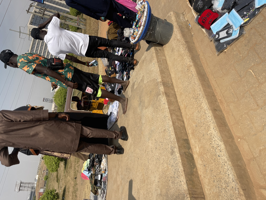 The scene depicts an outdoor informal market setting in Kuchingoro, Nigeria, on a clear, sunny day. In the foreground, two weathered concrete steps lead up from a dirt and gravel ground surface. On the lower ground to the right, an assortment of merchandise, including red and black baseball caps and light blue face masks packaged in plastic, is displayed on a dark surface. On the upper concrete level, several individuals are present amidst various items laid out for sale. From left to right: 1. A person, seen from behind, wears a brown long-sleeved tunic (agbada-style) and matching trousers with black shoes. 2. Partially obscured by the first person, another individual in dark attire, possibly a head covering, is visible. 3. A barefoot male in a green short-sleeved shirt with an orange repeating pattern, black shorts over neon green cycling shorts, and a black baseball cap. He carries a small black shoulder bag and holds a white smartphone in his left hand, looking towards the right. A rectangular patch featuring a person's image is affixed to his left shorts pocket. 4. Another male, wearing a white short-sleeved t-shirt, black jeans, and brown shoes. He wears a black baseball cap and touches his head with his right hand while holding a light-colored fabric item in his left hand. 5. A partially visible individual on the far right wears dark clothing, possibly a blue uniform, and carries a pink bag over their left arm. Merchandise, including clothing and accessories, is spread out on the ground on various cloths or tarps. A yellow and brown auto-rickshaw (Keke Napep) is partially visible in the mid-ground. To the right of the steps, a black bucket supports a circular tray displaying numerous canned beverages and small packaged goods. The background reveals a sparse, dry landscape with green patches of vegetation, a low wall or fence, and utility poles with power lines. Further in the distance, a tall lattice-structured tower stands on the left, while several modern multi-story buildings, one with a distinctive sloping design, are visible on the right under a clear blue sky.
