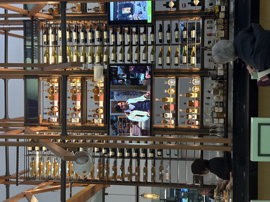 A bar interior shows shelves stocked with wine and liquor bottles. Multiple televisions are positioned among the shelves, displaying different content. Patrons are seated at the bar, with one visible on the right and another towards the bottom. The bar has a wooden frame structure. A white round object is suspended from the ceiling.
