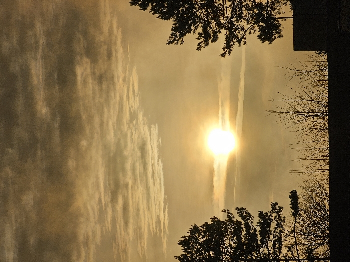 A golden sky is filled with long, linear clouds, resembling brushstrokes. The sun, a bright orb, sits amidst the clouds, radiating light. Silhouetted treetops frame the lower portion of the scene. Additionally, vapor trails bisect the image around the sun. Part of a building intrudes on the right side.