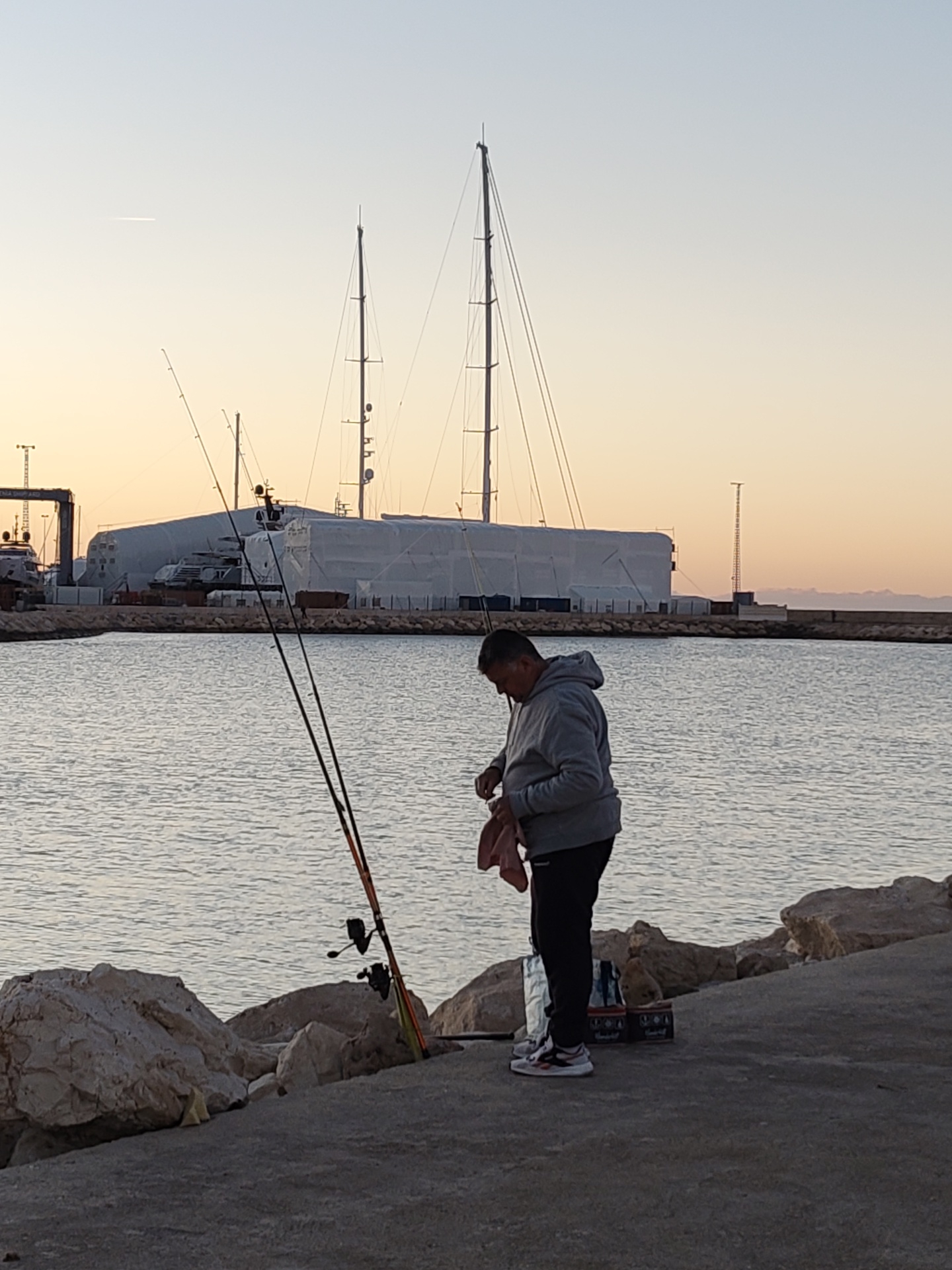A middle-aged man in a grey hoodie and black pants stands on a concrete pier near large rocks, with two fishing rods propped up to his left. He is holding a red cloth and appears to be cleaning something. Behind him, there are two boxes of beer. In the background, across the water, is a large covered structure with two tall masts visible above it. A smaller boat is visible to the left of the structure. The scene is set in Dénia, Spain, as the covered structure appears to be in the Dénia shipyard, where large yachts are routinely worked on. The sky is light with a pinkish hue, suggesting either sunrise or sunset. The sea is calm.