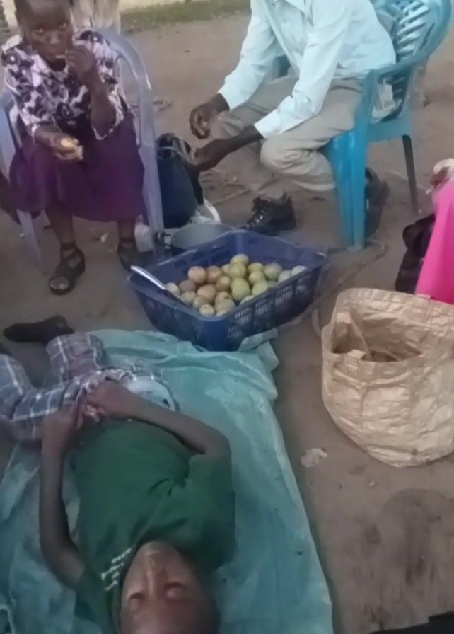 The video depicts an outdoor scene with several people, including a man, a girl, and a boy, sitting on or near plastic chairs. The boy is lying down on a blue cloth. A basket of fruit is visible between the chairs. The man is sitting and appears to be eating something. The girl is also sitting and eating something. A cow is visible in the background. The setting appears to be a rural area with a dirt or sandy ground.
