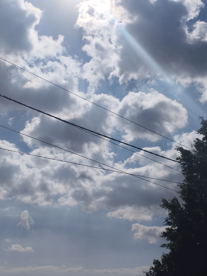 The image displays an upward view of a daytime sky over the city of Unknown, Unknown. The sky features scattered cumulus clouds, predominantly white and light grey, against a blue background. The sun is visible in the upper-left quadrant, partially obscured by clouds, creating a bright glare and a diagonal sunbeam extending towards the lower-right. Multiple dark utility lines, appearing as five distinct wires, traverse the mid-ground of the frame horizontally and diagonally. The dark green foliage of a tree is present along the right edge of the image, occupying the lower-right section. No people, buildings, or specific interactions are visible.