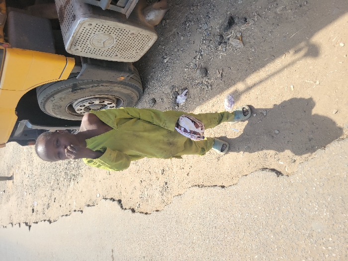 The image displays a young child, approximately 4-7 years old, standing on a dirt and gravel road shoulder in Suleja, Nigeria