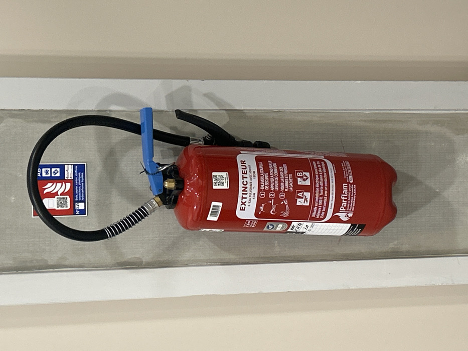 A red Parflam fire extinguisher, a 6-liter water mist unit with additive, is mounted on a light grey wall in the city of Suresnes, France