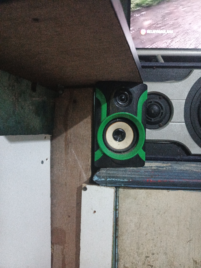 This image captures an indoor scene in Bandung City, Indonesia, focusing on a corner assemblage of electronic equipment and shelving. In the foreground, a black two-way speaker with prominent green vertical accents and a green ring around its lower, light-colored woofer cone is centrally positioned on a dusty, light-colored ledge or shelf. A smaller, dark tweeter is visible above the woofer. To the immediate right of this speaker, part of a larger audio system or speaker unit, appearing gray or light-colored, is discernible, featuring at least two dark, circular speaker drivers. Above these audio components, a segment of a television screen displays what appears to be a video game or outdoor footage of a dirt path, with the text "MELINYAMAULANA" partially visible on the screen's content. The equipment is situated beneath a horizontal dark-brown wooden shelf, which is secured by visible screws into vertical wooden or particleboard panels. A lighter, possibly white, vertical panel or wall is visible on the left, also secured with screws. All visible surfaces, including the shelves and equipment casings, show signs of dust and wear. No individuals are present in the frame.