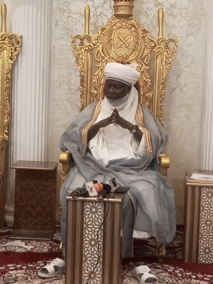 An older man wearing a white turban and grey robe sits in an ornate gold throne. He has dark skin and his hands are clasped in front of him. Two small tables flank the throne. The table to his left holds several microphones. A pair of white sandals are on the patterned carpet. The wall behind the throne is decorated with gold accents.