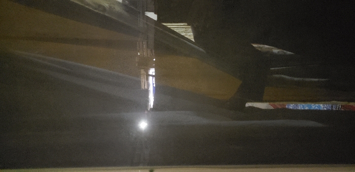 The image displays a low-light, likely nighttime, view of an exterior scene in Kandahar, Afghanistan, captured from an interior vantage point through a translucent barrier, such as a window or screen, which introduces glare and reflections. A prominent bright, circular white light source is visible in the upper-left quadrant of the distant background. To the right of this light, a building structure is discernible, characterized by a blue facade with a white coping, topped by darker, horizontal architectural elements. A significant, amorphous yellow-beige reflection occupies the mid-to-lower right foreground, obscuring portions of the background. Multiple subtle vertical and diagonal light streaks are present across the frame. In the lower-center, a folded or draped textile object, exhibiting blurred patterns in red, blue, and white, is faintly visible. The left edge of the image shows a light-colored vertical frame element, suggesting a window or doorway. No individuals or specific actions are observable. The environment appears to be an urban setting.