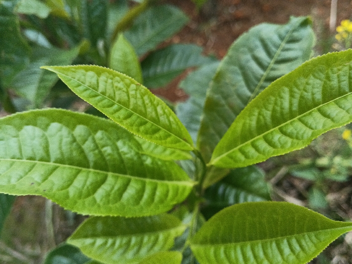 - "The image presents a close-up, top-down view of a cluster of vibrant green leaves, consistent with those of a tea plant (*Camellia sinensis*), situated in Khna, Cambodia" by FM-oQXKA3, licensed under CC BY 4.0