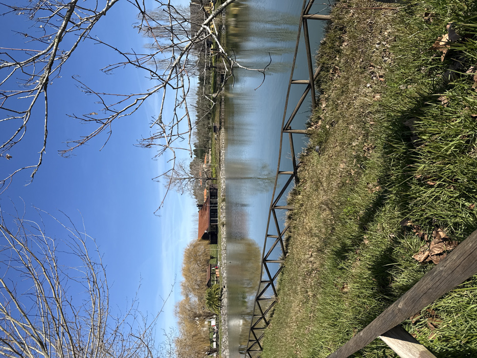 The image displays an outdoor daytime scene at a tranquil lake or pond in Cantanhede, Portugal. The foreground consists of a grassy bank with patches of green and dry brown grass, along with scattered fallen leaves. A wooden fence, constructed with horizontal rails and diagonal cross-members forming 'X' shapes, runs along the water's edge from the left mid-ground to the right mid-ground. A partially visible, larger wooden beam or fence post is present in the lower-left corner. The central element is the calm body of water, which reflects the clear blue sky and the distant trees and structures on the opposite bank. A small, dark, indistinct object, likely an aquatic bird, is visible on the water's surface towards the left. On the far side of the water, a cluster of trees with sparse, light-colored foliage is visible on the left. Adjacent to these trees, a building with a reddish-brown tiled roof and dark walls, possibly a restaurant or leisure facility, is prominent. This building features multiple large windows or open sections facing the water, and a chimney is visible on its roof. A small, dark-roofed structure, possibly a gazebo or picnic shelter, is situated among the trees to the left of the main building. Further to the right, more bare-branched trees line the distant bank. The upper portion of the frame is dominated by a clear, vibrant blue sky. Out-of-focus, bare tree branches partially frame the top and sides of the image, suggesting a season without full foliage. The scene is illuminated by bright sunlight, casting distinct shadows on the grassy foreground.