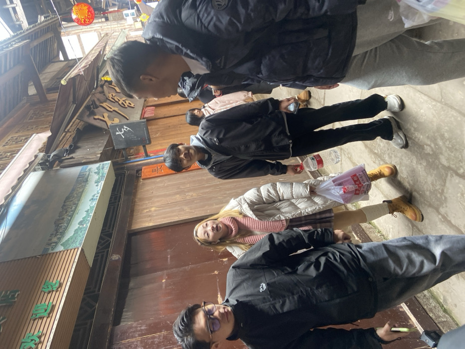 A group of people stand on a cobblestone street lined with wooden buildings. One wears a black jacket and grey pants, while another sports a black jacket and black pants. A woman is wearing a pink sweater, puffy coat, and brown boots. Another person in a black jacket and grey pants is holding a phone. A sign hangs on one of the buildings. Lanterns are visible in the distance above the buildings.