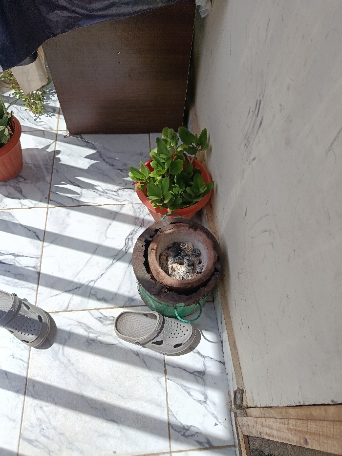 The scene is an outdoor tiled area in Nyanya, Nigeria, illuminated by direct sunlight which casts distinct striped shadows across the floor. The floor consists of white tiles with grey marble-like patterns. Along the right side, a light-colored wall exhibits dark scuff marks. In the lower left, two light grey, perforated clogs are positioned on the tiles. Adjacent to them, a green metal charcoal stove topped with a clay pot containing charcoal ashes rests near the wall. Two potted plants are present: one in an orange-brown pot in the upper left, and another in a reddish-orange pot in the upper center, both containing green foliage. A dark brown wooden object is partially visible in the upper left background. No individuals are depicted.