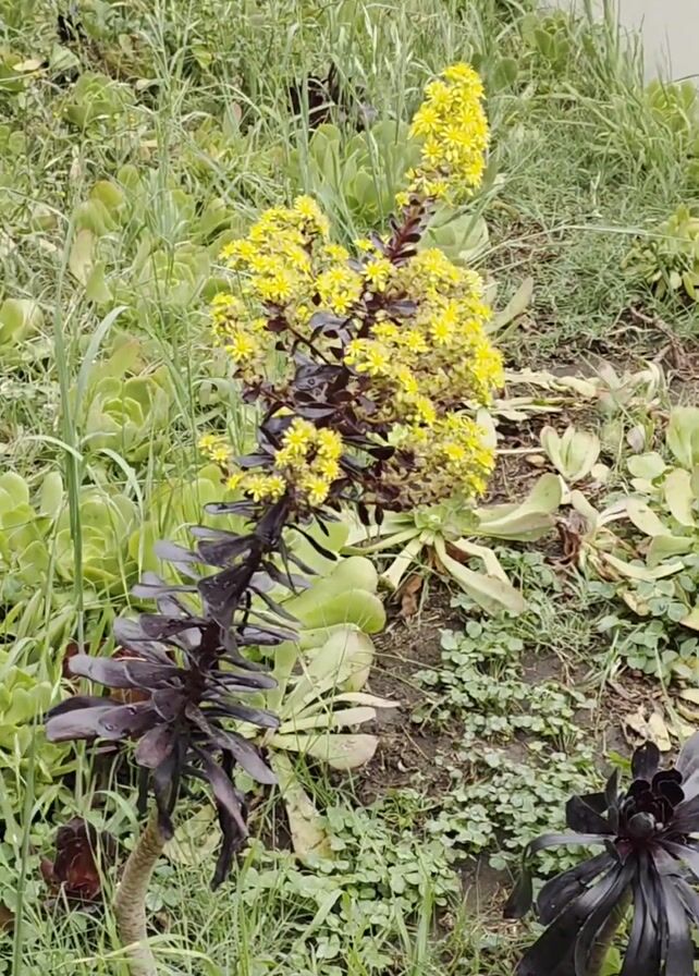 The camera pans across a garden bed containing various succulent plants. These plants include dark purple Aeonium arboreum, some flowering with tall stalks of bright yellow flowers, and other light green succulents. There is also various tall grass and ground cover. The background shows a neutral-colored wall. The camera moves slowly, providing a full view of the plants within the garden bed.