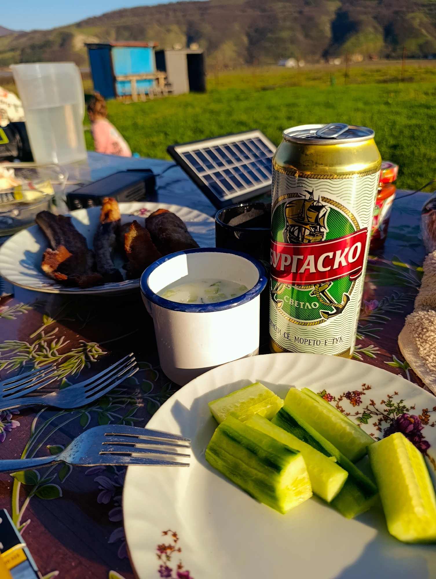 The image captures a picnic setup against a backdrop of rolling hills and greenery in what appears to be a rural setting near Shiroko pole, Bulgaria. A table is covered with a floral-patterned tablecloth, upon which various food and drink items are arranged. A plate of grilled meat sits next to a mug filled with a yogurt and cucumber salad, commonly known as Tarator. A can of "Burgasko" beer, a Bulgarian brand, stands prominently on the table, alongside a plate of sliced cucumbers. Silverware, a solar panel, and other miscellaneous items are also present. In the background, there's a glimpse of a small structure and a person, suggesting a casual outdoor gathering. The scene is bathed in natural sunlight, enhancing the colors and details of the food and surrounding environment.