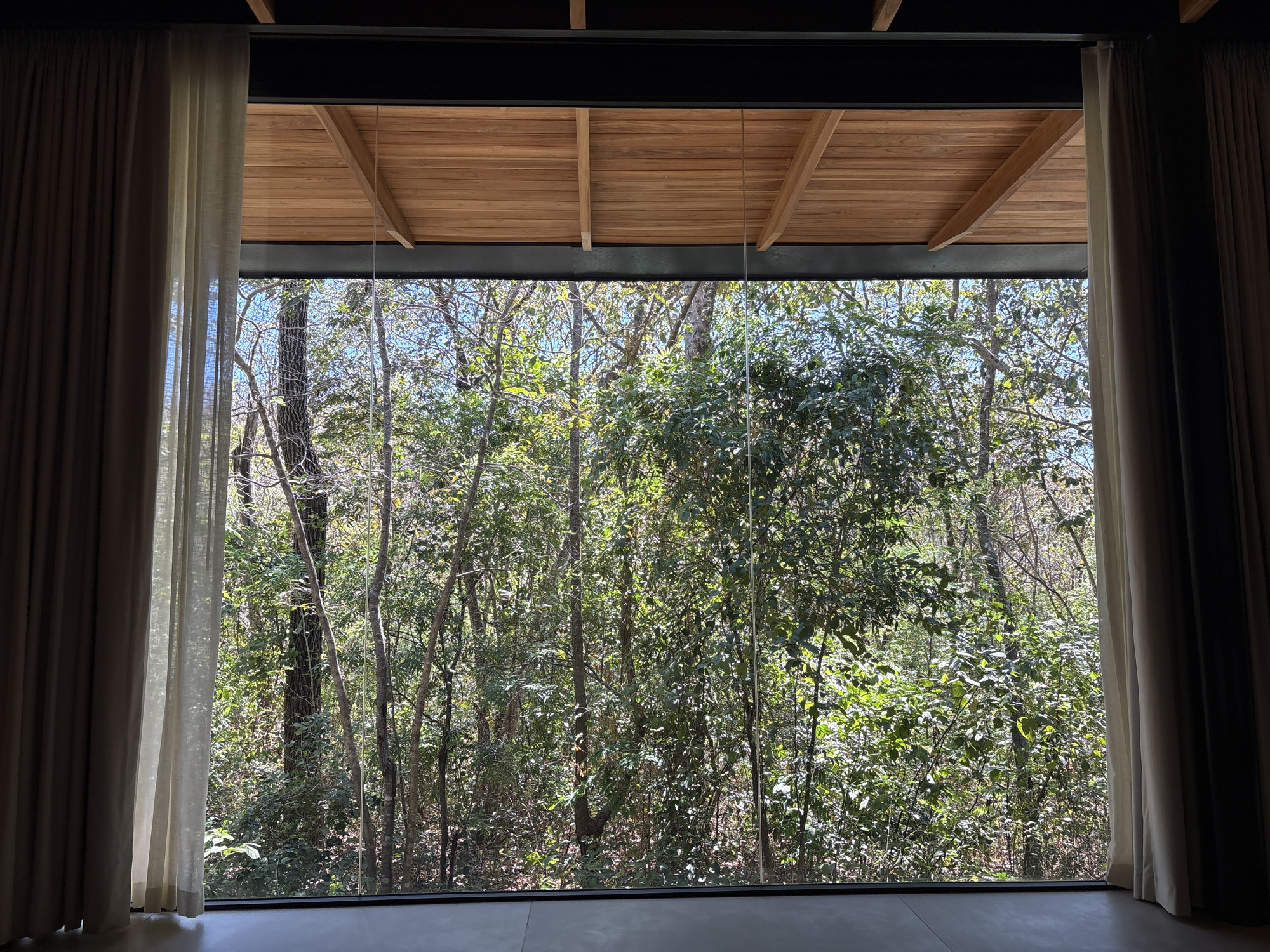 The scene depicts an interior space looking outward through a large, floor-to-ceiling glass window into a dense forest environment, specifically located in La Fortuna, Costa Rica. The window is bordered on both vertical sides by partially drawn curtains, consisting of an outer dark beige layer and an inner sheer light-colored layer. Above the window, a dark structural beam supports a wooden plank ceiling featuring visible crossbeams. The immediate foreground shows a light-colored, smooth floor surface. Beyond the window, the outdoor environment is dominated by a sunlit, verdant forest with numerous broadleaf trees, exhibiting varied foliage densities and trunk appearances. Patches of clear blue sky are visible through the tree canopy. No individuals or specific actions are discernible within the frame.