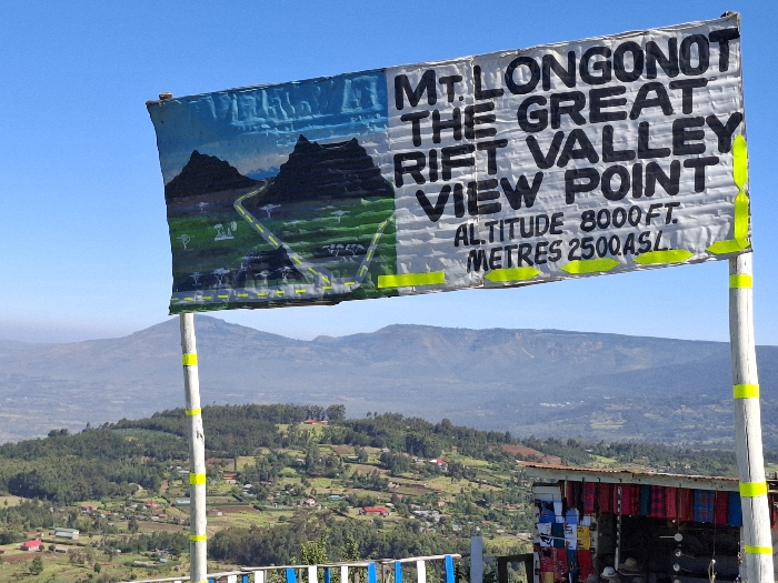 large sign with the words "Mt. Longonot The Great Rift Valley View Point Altitude 8000ft. Metres 2500ASL". It is located at the "Mt. Longonot The Great Rift Valley View Point" in Escarpment, Kenya, with coordinates of -1.021 latitude and 36.622 longitude. The sign is mounted on two white wooden posts. The sign is made of a white material and is brightly colored with a map on one side and the text on the other. In the background, a small village is visible in the valley, surrounded by a lush green forest. Beyond the forest is a large valley with mountains in the distance. The sky is clear blue and the sun is shining. There is a small, unidentifiable structure with goods for sale near the base of the sign.