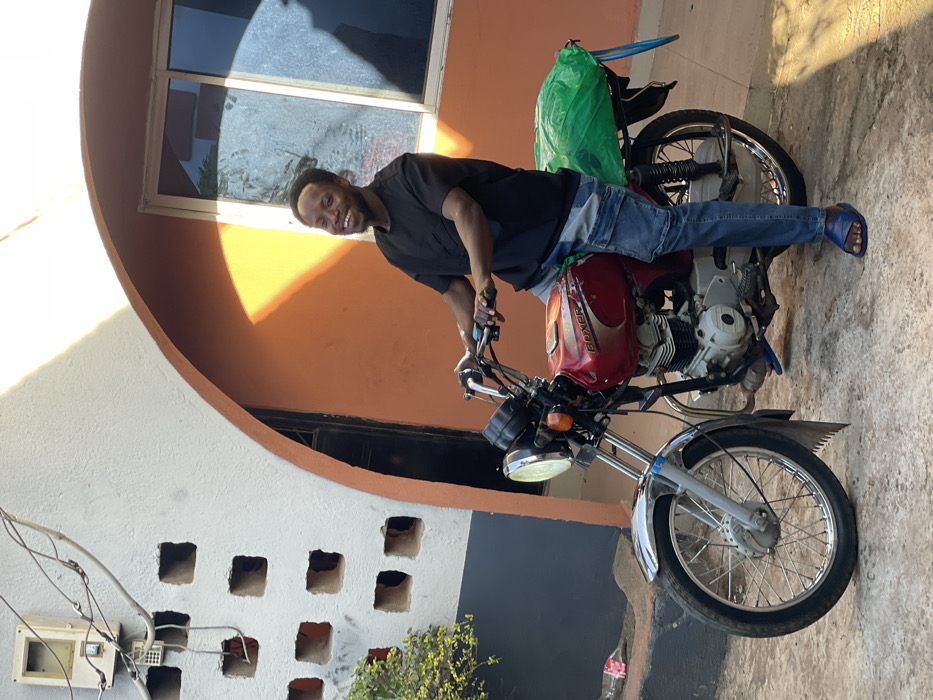 An adult male is seated on a red Bajaj Boxer motorcycle, smiling directly at the camera