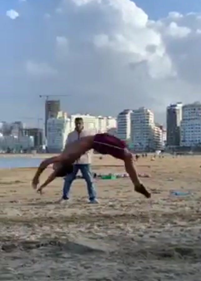 On a sunny day at the beach, a young man wearing maroon shorts performs acrobatic moves