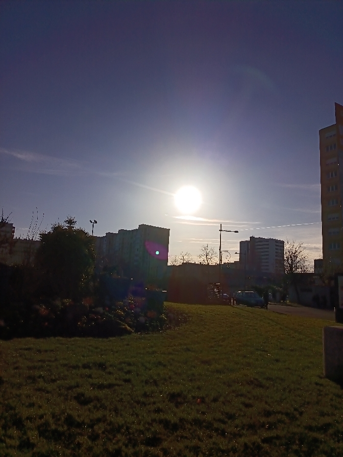 This image depicts an urban landscape in Bischheim, France, under daylight conditions. The bright sun is positioned centrally in the upper half of the frame, generating significant glare and distinct purple/pink lens flares against a clear blue sky that includes faint white streaky clouds. In the foreground, a green grass lawn occupies the lower half, showing areas of both illumination and shadow. On the extreme lower left, a dark, low-lying structure, possibly a retaining wall or planter, is visible. Above this, a dense cluster of dark green shrubbery is present, partially obscuring a multi-story building with a light-colored facade. To the right of the shrubbery, a black street lamp post with two luminaires extends upwards. A road segment is visible beyond the lamp post and shrubbery, where a light-colored passenger vehicle, possibly light blue or grey, is situated. A dark, indistinct human figure is partially visible near this vehicle. Further in the midground, additional multi-story residential buildings are discernible, including a prominent white or light grey structure further down the street and other darker buildings silhouetted against the horizon. Sparse, bare deciduous trees are also visible along the horizon line in the mid-distance. A tall, multi-story building with an orange-beige facade and numerous windows occupies the entire right vertical edge of the frame, extending from mid-frame to the top.