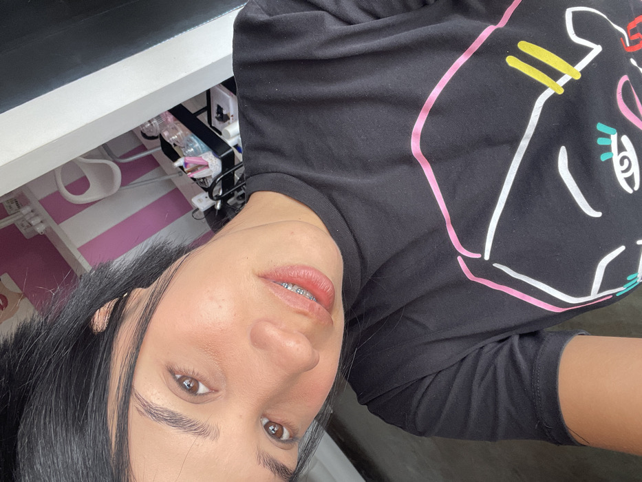 The scene is located in Altagracia, Venezuela. A female subject is depicted in a close-up, self-portrait style photograph, looking directly at the camera. She has dark hair styled away from her face, light brown eyes, and visible dental braces on her upper teeth. Her skin appears to have a natural flush. She is wearing a black crew-neck t-shirt featuring a stylized, abstract, line-art graphic of a face with multi-colored accents (pink, white, yellow, light blue, and red). The background on the left consists of a wall with vertical pink and white stripes. To the right, further back, a white, modern-design chair with a curved backrest is visible. Below the chair, a multi-tiered utility cart holds several bottles, containers, and various implements, indicative of a beauty or personal care establishment.