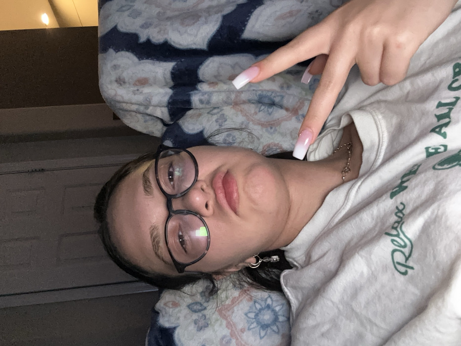 A young female, appearing to be in an indoor residential setting in Spring Valley, United States, is depicted in a close-up, head-and-shoulders shot. She is positioned lying down, with her head resting on a patterned pillow or blanket. She has dark hair, dark-rimmed glasses reflecting green light, and is making a pouting facial expression with her lips puckered. She wears a light-colored crewneck sweatshirt with partial green text visible, starting with "Relax." A thin, gold-colored chain necklace is around her neck, and a silver hoop earring with a dangling clear rectangular bead is visible in her left ear. Her left hand is raised, extending the index and middle fingers in a 'V' shape, commonly known as a peace sign. Her long, square-tipped fingernails feature a French ombre design, fading from white tips to a natural pink base. In the background, to her left, a light-colored pillow with a blue floral pattern is visible. To her right, a dark blue and white patterned blanket or comforter is present. A partially open white paneled door is visible in the upper left background, and a darker area with a faint light source is in the upper right. The scene is dimly lit.
