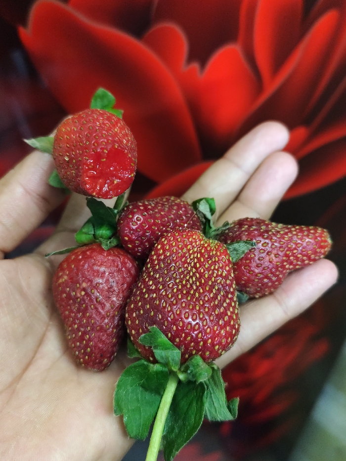 A human hand, appearing light-skinned, is positioned centrally, cupping five ripe strawberries. Each strawberry is deep red, covered with numerous small yellow-gold achenes, and retains a green calyx and a short green stem. One strawberry, located towards the upper left, exhibits a visible indentation or bite mark on its side, exposing lighter red flesh. The hand is open, supporting the arrangement of fruit. The background is a heavily blurred, abstract composition of intense red and maroon tones, suggestive of a large floral element or folded fabric. The specific location within Dhaka, Bangladesh, cannot be determined from the visual information present in the image.