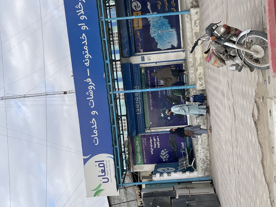 This image depicts a street scene in Kandahar, Afghanistan, featuring a commercial building and several individuals on a paved sidewalk under an overcast sky. In the foreground, a light-colored motorcycle is parked on the left side of the sidewalk, angled slightly right, with a multicolored bundled item secured to its front. Behind the motorcycle, on the sidewalk, a group of four individuals is present. To the left, a person in dark attire with a head covering faces right, engaged in conversation with a bearded man wearing a light-colored shalwar kameez and skullcap, who faces left. A small child in a dark blue dress with red shoes stands between these two adults. To the right, another individual, wrapped in a patterned blanket-like garment, faces away from the camera and is positioned near a storefront entrance, appearing to enter or exit. The commercial building features a prominent blue sign spanning its upper facade. The sign displays "Afghan Telecom" in white English text, accompanied by Dari/Pashto script indicating "sales and services." A blue corrugated awning extends over the storefronts below this main sign. Two adjacent storefronts are visible; both have partially closed blue roll-down shutters. The left storefront's window displays an advertisement for "DSL Check Internet" with network graphics and two silver waiting chairs visible inside. The right storefront displays a poster featuring a map of Afghanistan. To the far left of the storefronts, a stack of large, gray, rectangular items, resembling electronic appliances, is visible. Overhead, numerous utility wires crisscross against the cloudy sky, and a tall, slender metal communication tower rises in the background.