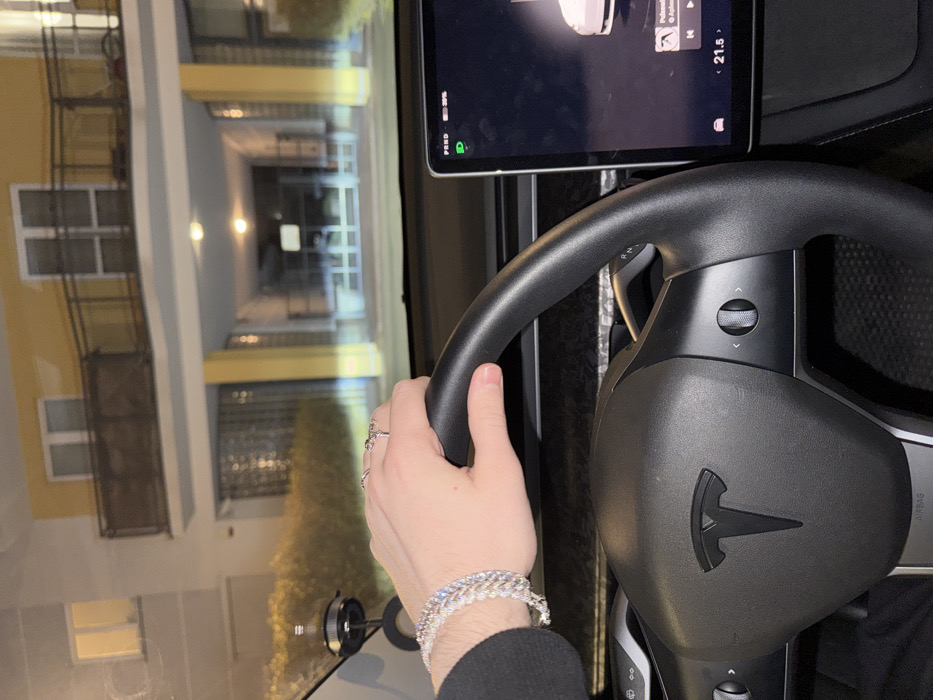 The view from inside a Tesla shows a driver's hand holding the steering wheel, which prominently displays the Tesla logo. A large display screen sits above the steering wheel, showing various car functions and information. Through the front windshield, a building with yellow walls and multiple floors is visible. The person's arm and wrist are visible, adorned with a ring and a sparkling bracelet.