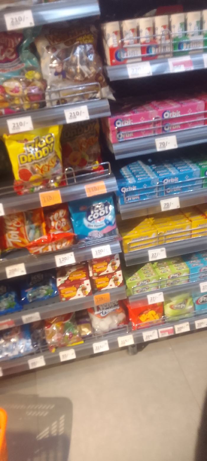 The image depicts an interior scene within a retail establishment, likely a supermarket or convenience store, located in Viwandani ward, Kenya. The primary focus is on a vertical arrangement of six grey metal shelving units stocked with a variety of packaged confectionery and chewing gum products. On the left side, shelves display bagged candies and snacks. The second shelf from the top features a prominent yellow bag labeled "Big DADDY XOXO," priced at "210/-". Below it, a blue bag of "ICE COOL Mint Flavours GUM" is visible, priced at "118/-". Other bags, including one partially visible red package and others with colorful contents, occupy these shelves, bearing price tags such as "210/-", "118/-", "120/-", and "85/-". The right side of the image is dominated by displays of "Orbit" brand chewing gum. The top right shelf shows multiple white, red, and green packets of "Orbit" gum sticks. Below this, shelves exclusively contain pink and blue boxes of "Orbit" chewing gum, each priced at "70/-". Further down, yellow packages, possibly "Juicy Fruits," are priced at "100/-". Additional shelves showcase square packages with red and white patterns, priced at "120/-", alongside green packages labeled "Piko," priced at "27/-". A white bag of "YENEE Popcorn" is visible, priced at "178/-", among other assorted candies and snacks with prices like "335/-", "204/-", and "300/-". All products are clearly labeled with white price tags indicating values in Kenyan Shillings (e.g., "210/-", "70/-"). The floor in the foreground is light grey and smooth. A partial view of a grey plastic shopping basket with an orange handle is visible in the lower-left corner. No individuals are present within the frame. The lighting is bright and even, suggesting artificial illumination characteristic of a commercial interior.