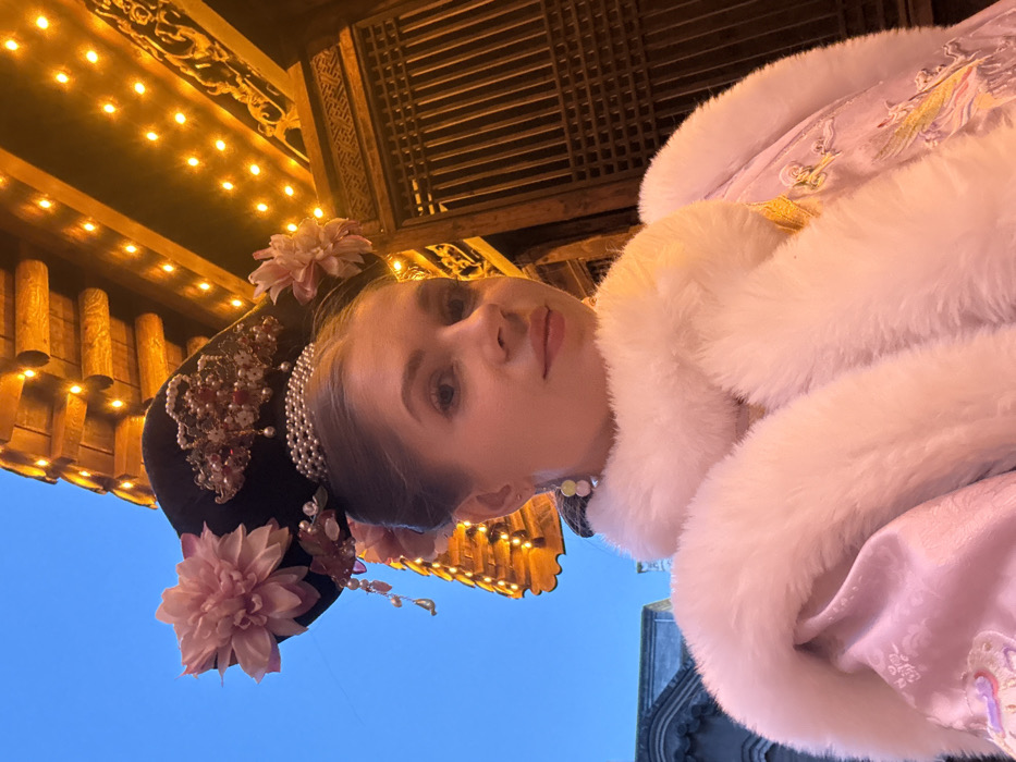 A female individual is depicted in a close-up, eye-level portrait against a traditional Chinese architectural backdrop in Dongcheng District, China